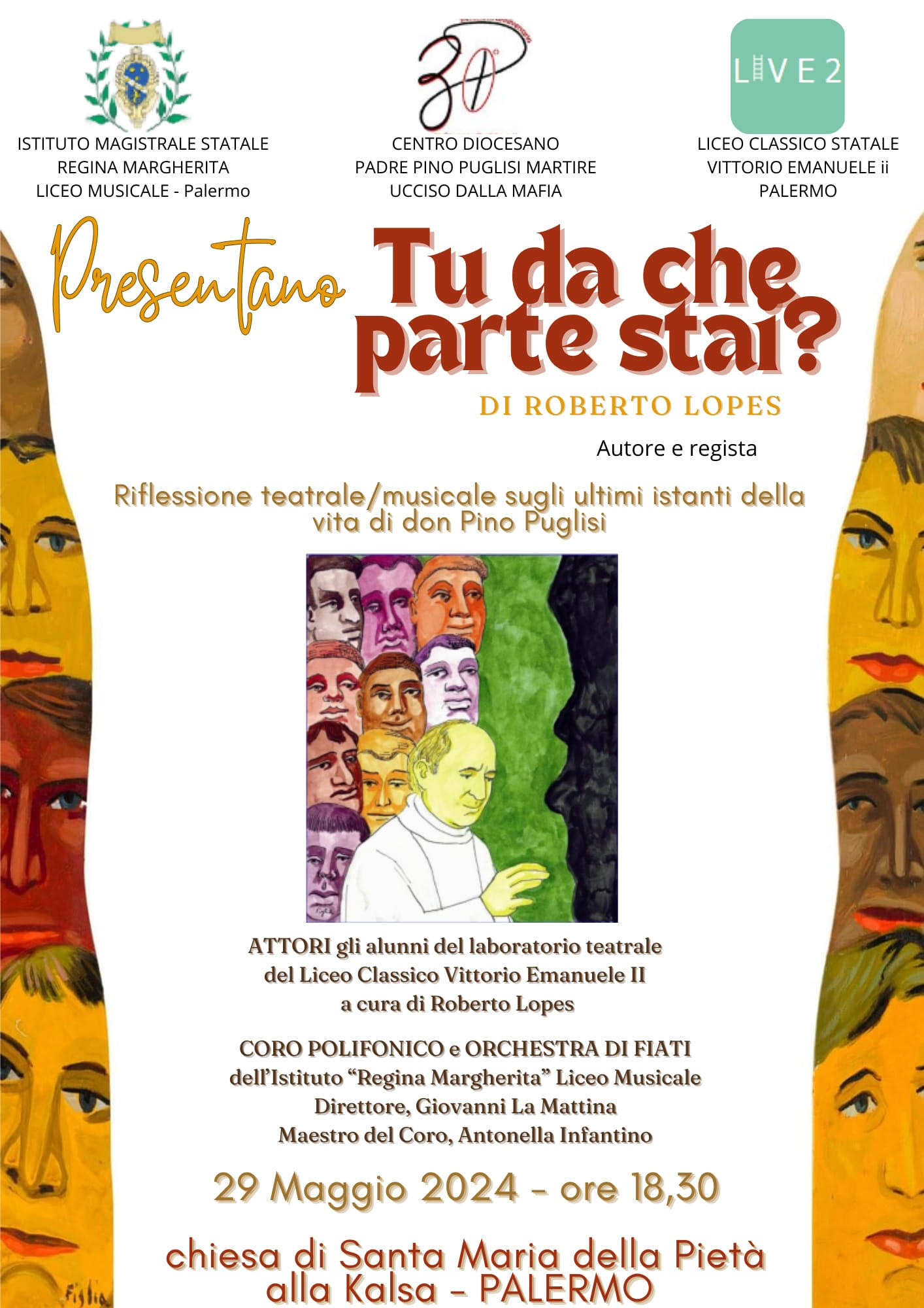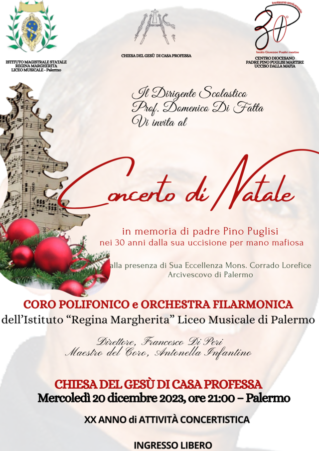 A 30 anni dall'omicidio di Padre Pino Puglisi, il LICEO "Regina Margherita" Palermo ha dedicato il Concerto di Natale (direttore Francesco Di Peri, maestro del coro Antonella Infantino) al sacerdote ucciso dalla mafia. Il concerto, tenuto nella Chiesa “Gesù di Casa Professa” e alla presenza di S. E. Mons. Corrado Lorefice Arcivescovo di Palermo, ha visto l’alternanza di brani di musica sacra, dal Barocco al Contemporaneo, con la lettura di testi, in forma di dialogo, riferiti a Padre Pino Puglisi